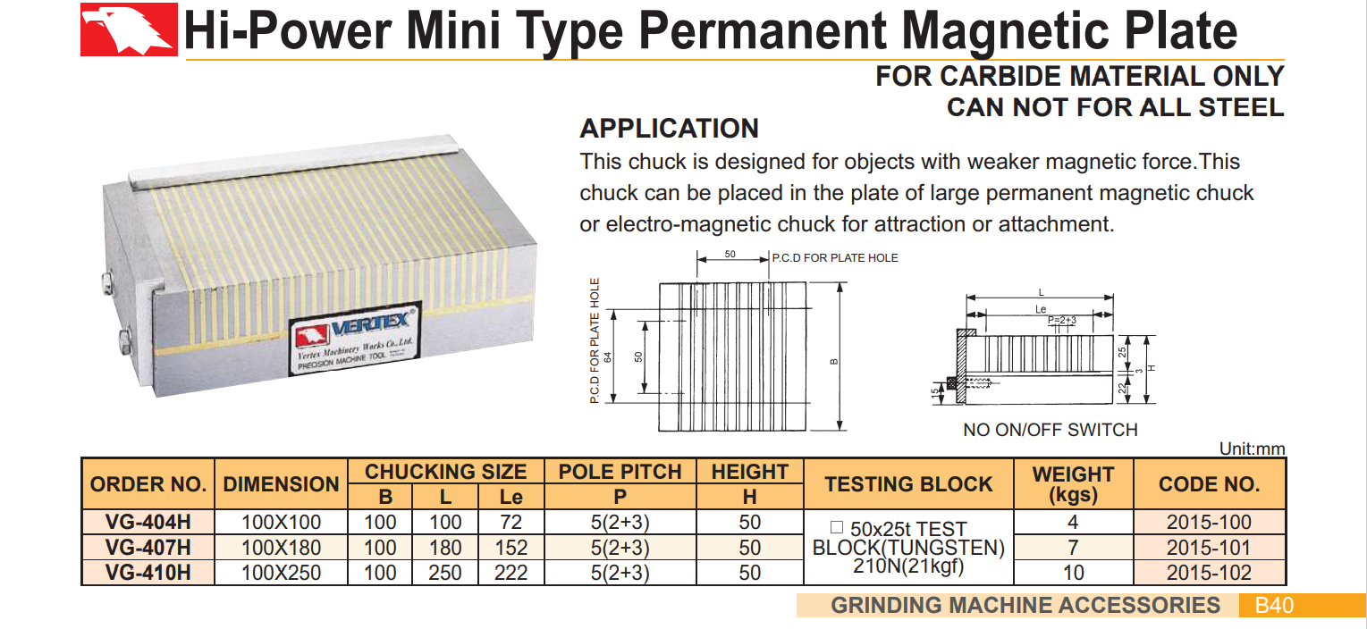 Bàn từ 100×100 Vertex VG-404H , VG-407H , VG-410H dùng để gá các ê tô máy mài trong quá trình mài nghiêng.