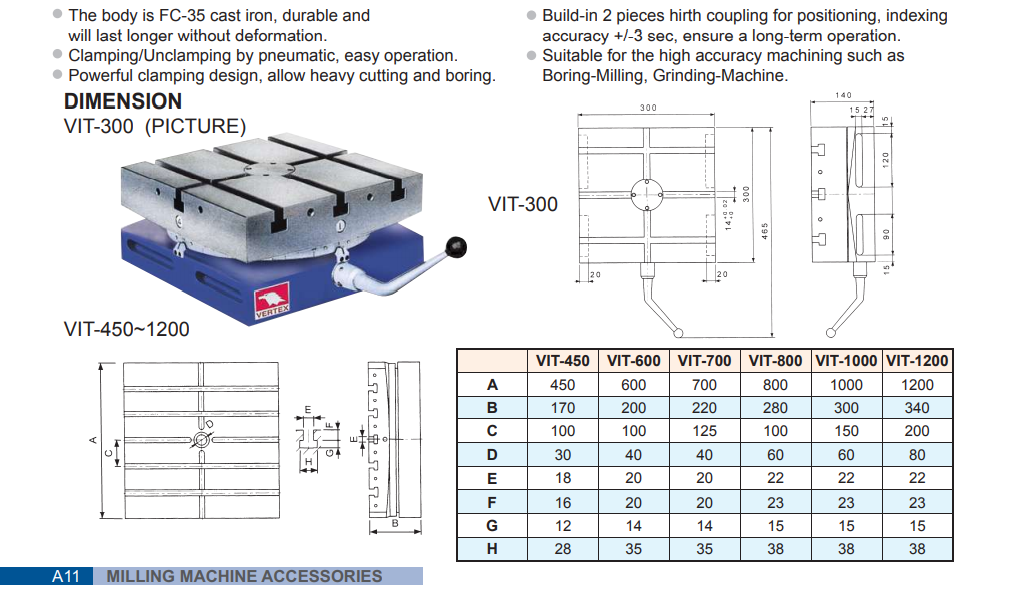 Cũng giống như bàn máy thông thường khác loại BÀN XOAY ĐỊNH VỊ CHÍNH XÁC VERTEX, cũng được thiết kết các rãnh chữ T để hỗ trợ việc kẹp chặt, các bề mặt được làm phẳng một cách chính xác, tránh gây số gá đặt nhiều khi sử dụng.