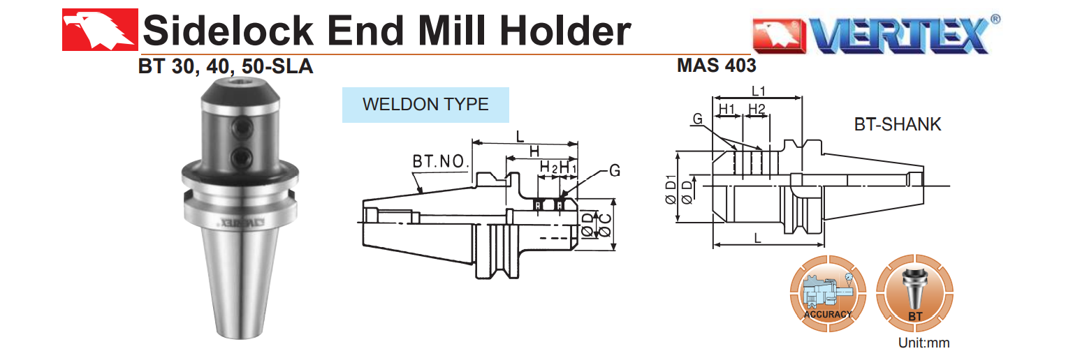 – Bầu kẹp dao phay kiểu vít kẹp BT30, BT40, BT50 – SLA: BT-436, BT-437, BT-438, BT-439, BT-440, BT-441, BT-442, BT442, BT-443, BT-444, BT-445, BT-446, BT-447, BT-448, BT-449, BT-450, BT-451, BT-452, BT-453, BT-454, BT-455, BT-456, BT-457, BT-458, BT-459, BT-460, BT-461, BT-462, BT-463, BT-464, BT-465, BT-466, BT-467, BT-468, BT-470, BT-471, BT-472, BT-474, BT-477, BT-478, BT-479 của VERTEX kẹp dao phay đường kính từ 6-42mm và lắp lên máy phay CNC có trục chính kiểu côn BT30, BT40, BT50.