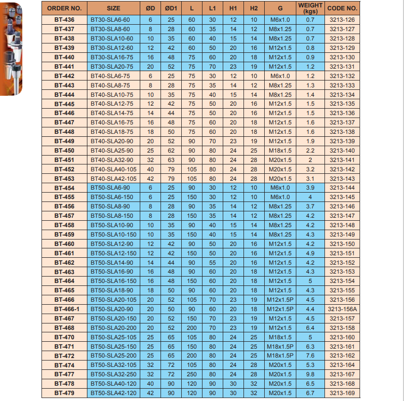 – Bầu kẹp dao phay kiểu vít kẹp BT30, BT40, BT50 – SLA có 2 vít kẹp trên thân bầu kẹp, kẹp dao phay rất chắc chắn, cho phay với tốc độ cao trên máy phay CNC.