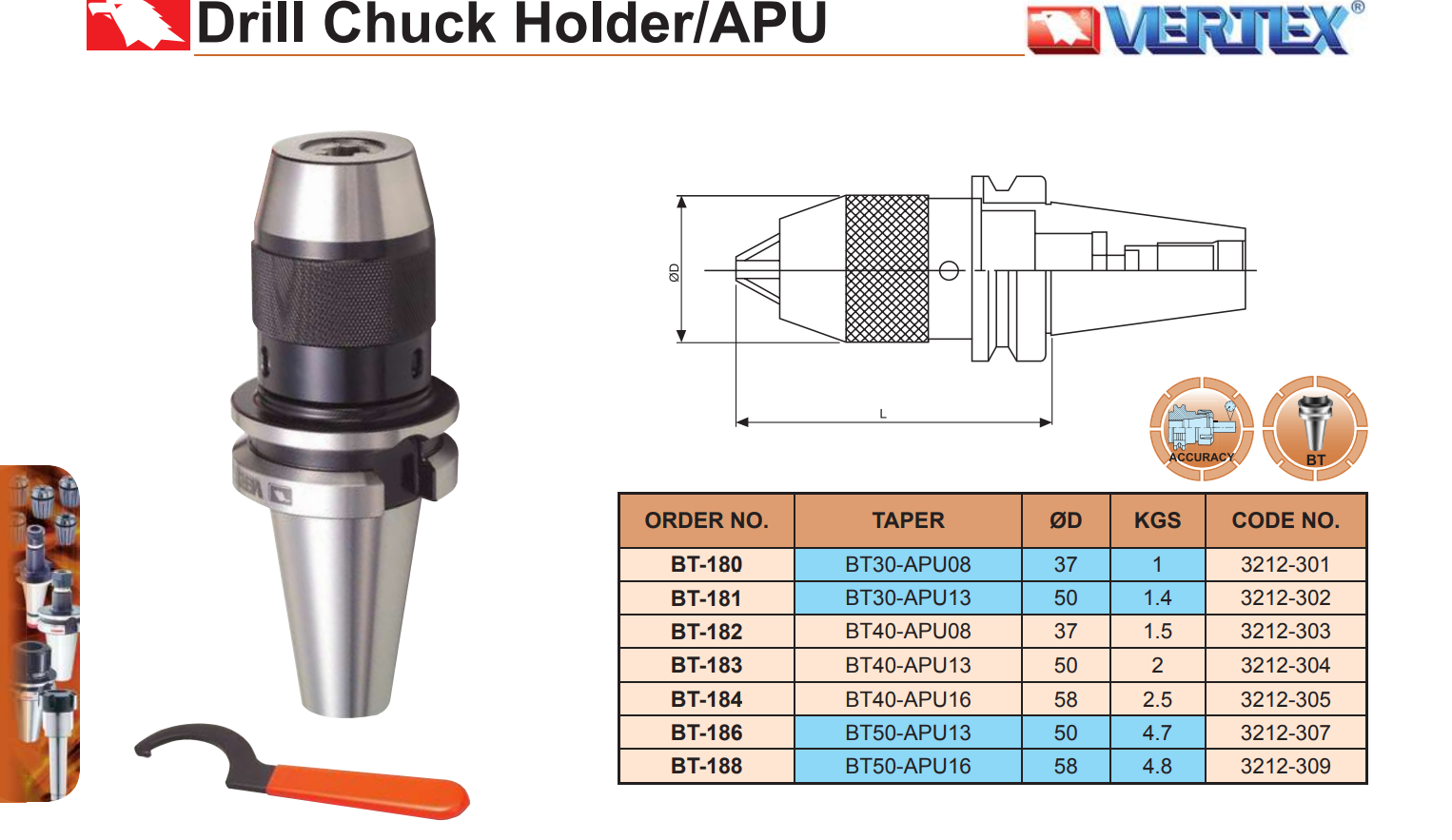 – Bầu kẹp mũi khoan BT30, BT40, BT50 – APU: BT-180, BT-181, BT-182, BT-183, BT-184, BT-186, BT-188 của VERTEX kẹp mũi khoan đường kính từ 0-16mm và lắp lên máy phay CNC có trục chính kiểu côn BT30, BT40, BT50.
