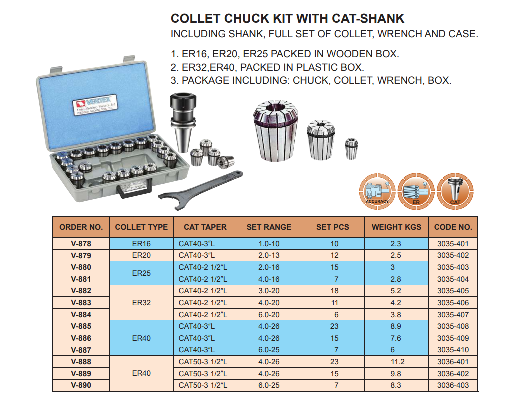 – Có thể đặt hàng theo bầu kẹp đơn lẻ (không có chìa vặn) hoặc cả bộ (bao gồm: bầu kẹp, bộ collet, chìa vặn và hộp; xem các model bộ ở bảng trên).
