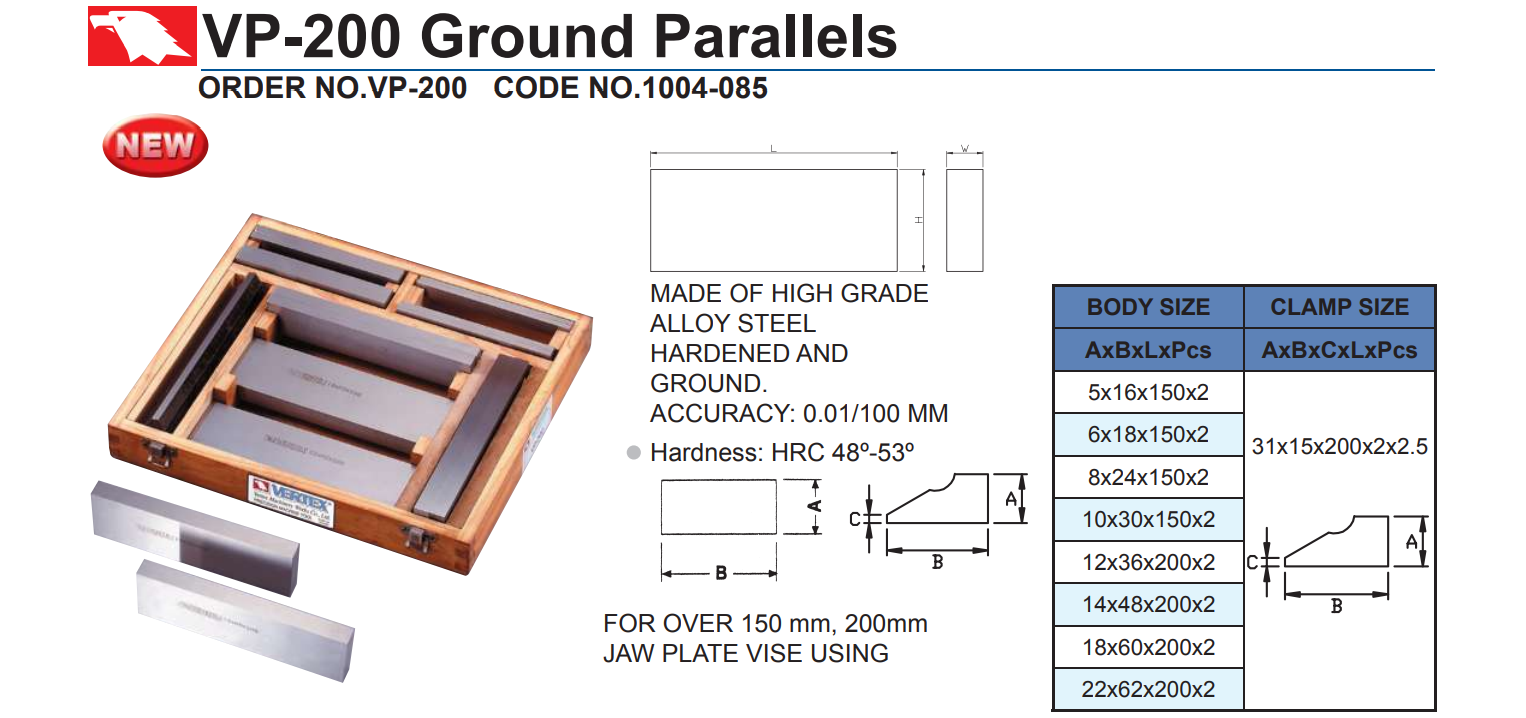 BỘ CĂN ĐỆM SONG SONG mã VP-200 được hãng Vertex sản xuất, sản phẩm chuyên dùng cho việc căn chỉnh, kê gá trong quá trình gá đặt trên bàn máy khi gia công nhằm đạt độ chính xác cao.