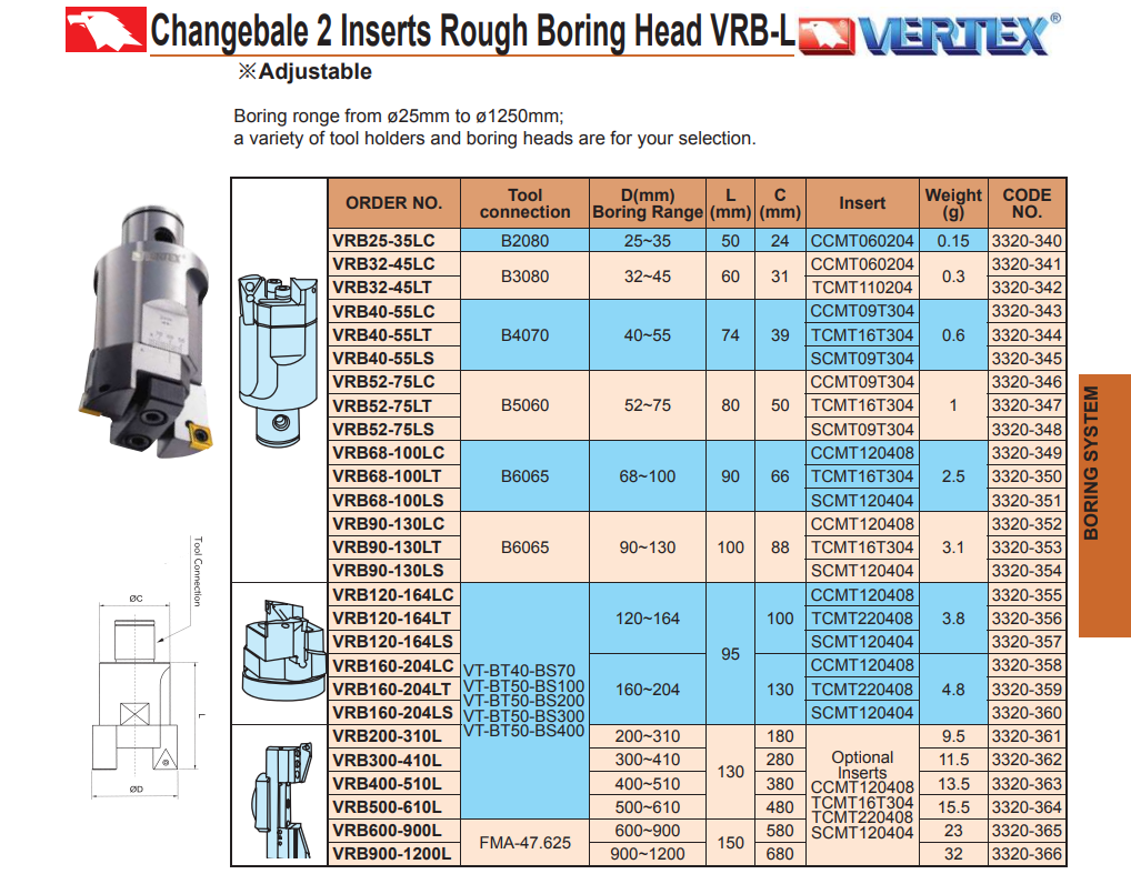– Đầu dao doa thô ghép mảnh từ D25 ~ D1200: VRB25-35LC, VRB32-45LC, VRB32-45LT, VRB40-55LC, VRB40-55LT, VRB40-55LS, VRB52-75LC, VRB52-75LT, VRB52-75LS, VRB68-100LC, VRB68-100LT, VRB68-100LS, VRB90-130LC, VRB90-130LT, VRB90-130LS, VRB120-164LC, VRB120-164LT, VRB120-164LS, VRB160-204LC, VRB160-204LT, VRB160-204LS, VRB200-310L, VRB300-410L, VRB400-510L, VRB500-61L, VRB600-900L, VRB900-1200L của VERTEX sử dụng doa thô đường kính lỗ từ D25 ~ D1200mm, trên máy phay CNC BT30, BT40, BT50.
