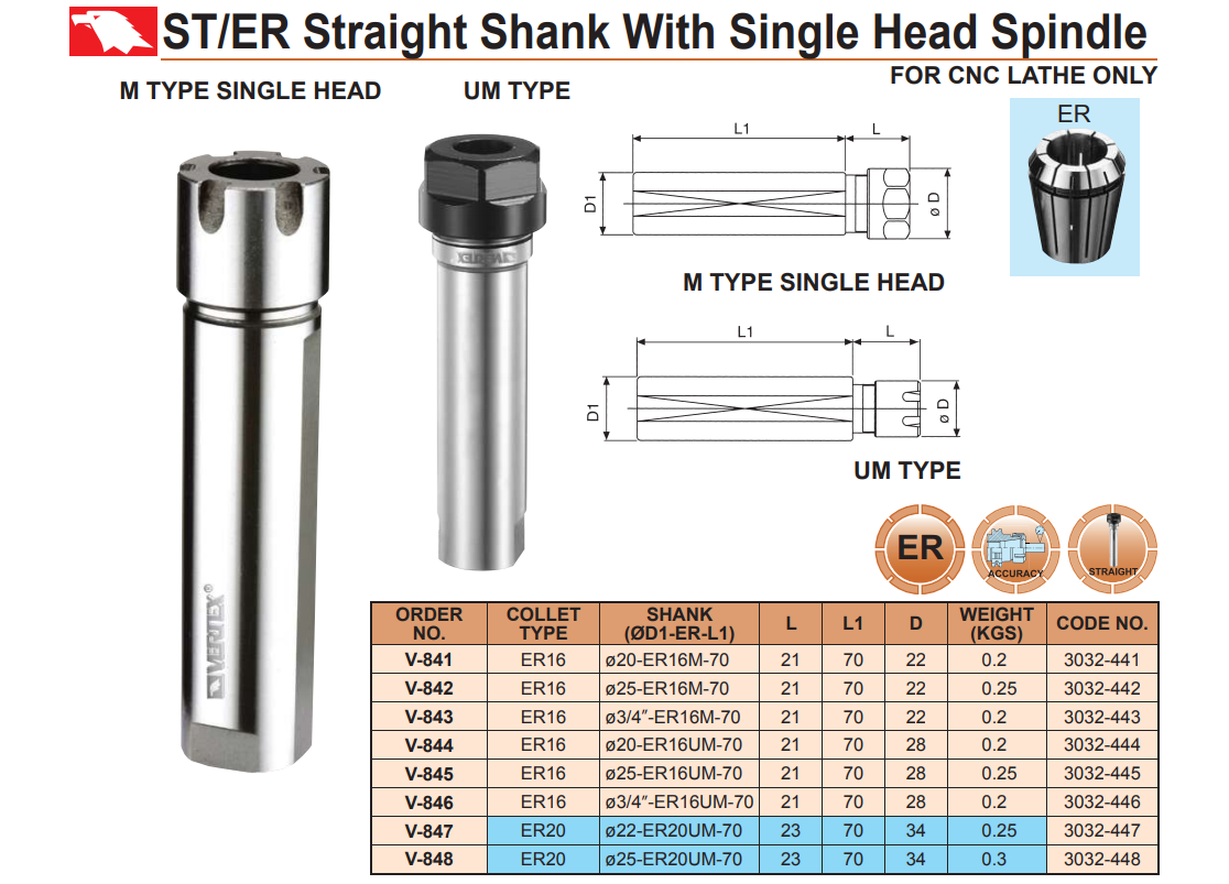– Collet ER11, ER16, ER20 theo tiêu chuẩn DIN 6499 (xem sản phẩm Collet ER).