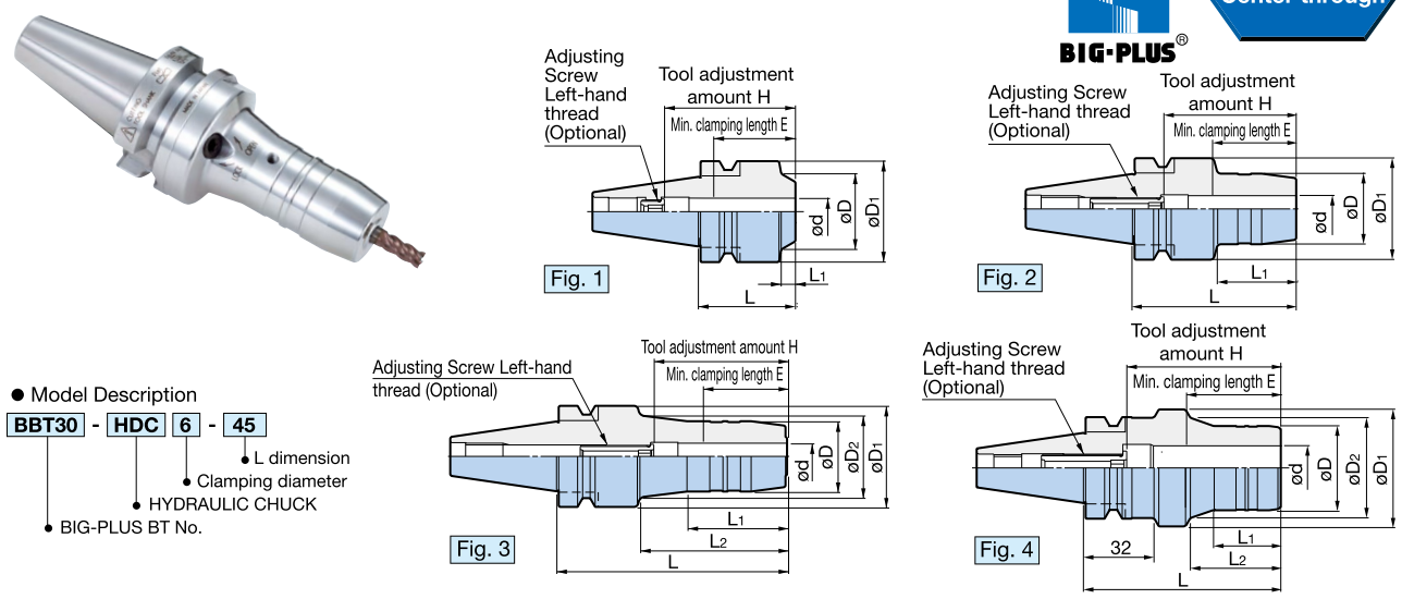 | BBT SHANK Model | Fig. | Clamping diamater φd | φD | ΦD1 | ΦD2 | L | L1 | L2 | H | E | Adjusting Screw(Optional) |
