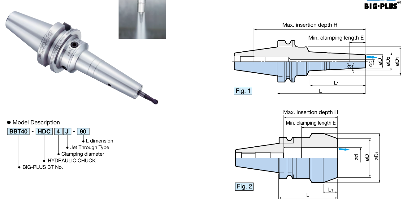 | BBT SHANK Model | Fig. | Clamping diamater φd | φD | ΦD1 | ΦD2 | L | L1 | H | E |