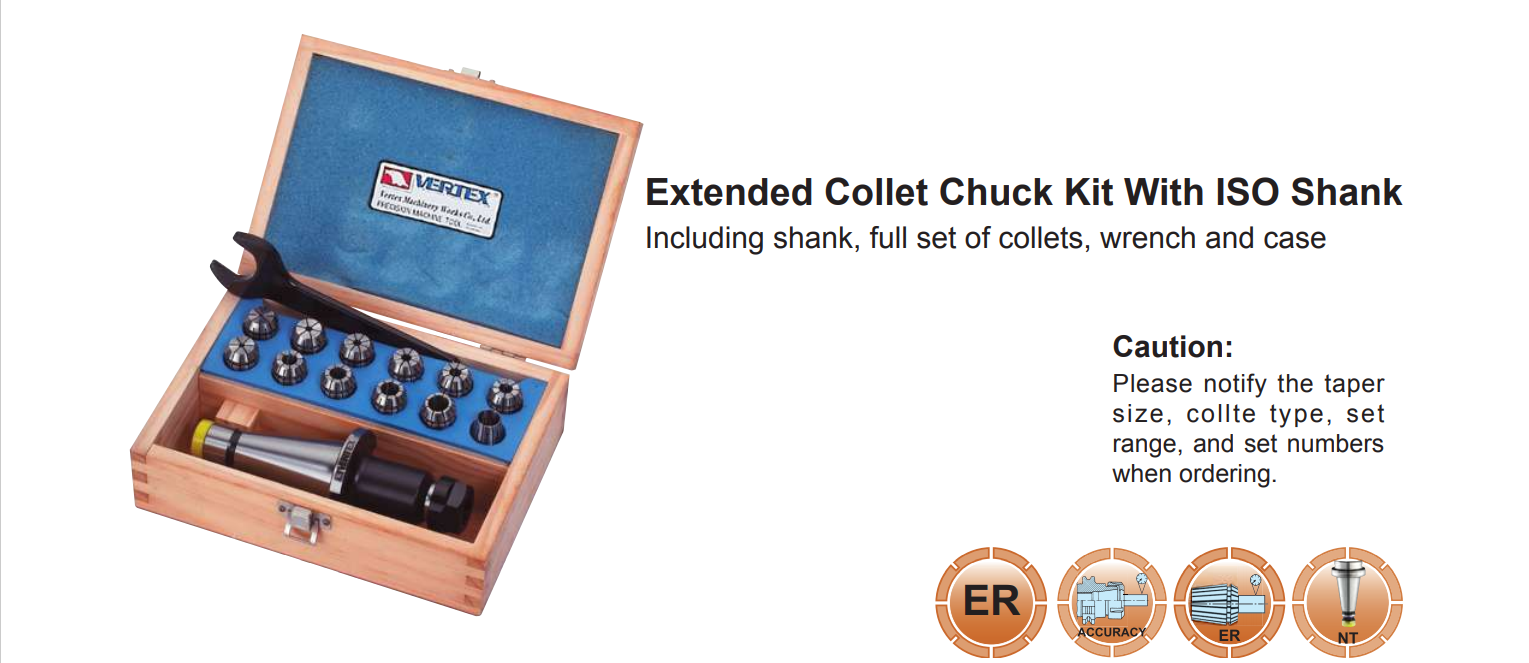 Đầu kẹp kiểu NT collet ER loại dài mã V-231, V-232, V-233, V-234, V-235 hãng Vertex sản xuất với chất lượng cao, bầu kẹp dao phay này được sử dụng nhiều trên các loại máy gia công cơ khí. Sản phẩm được phân phối trên toàn quốc