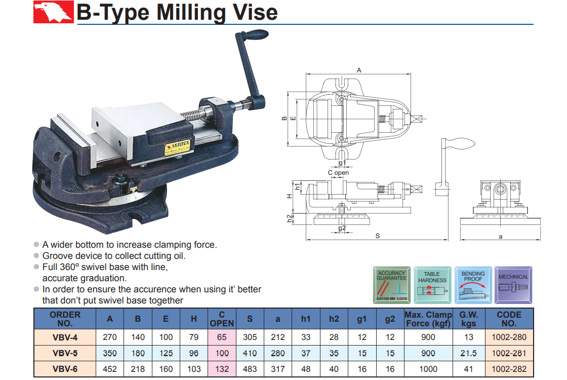 – Ê tô máy phay VERTEX VBV-4, VBV-5, VBV-6 có các rãnh khía để dẫn thu dầu.