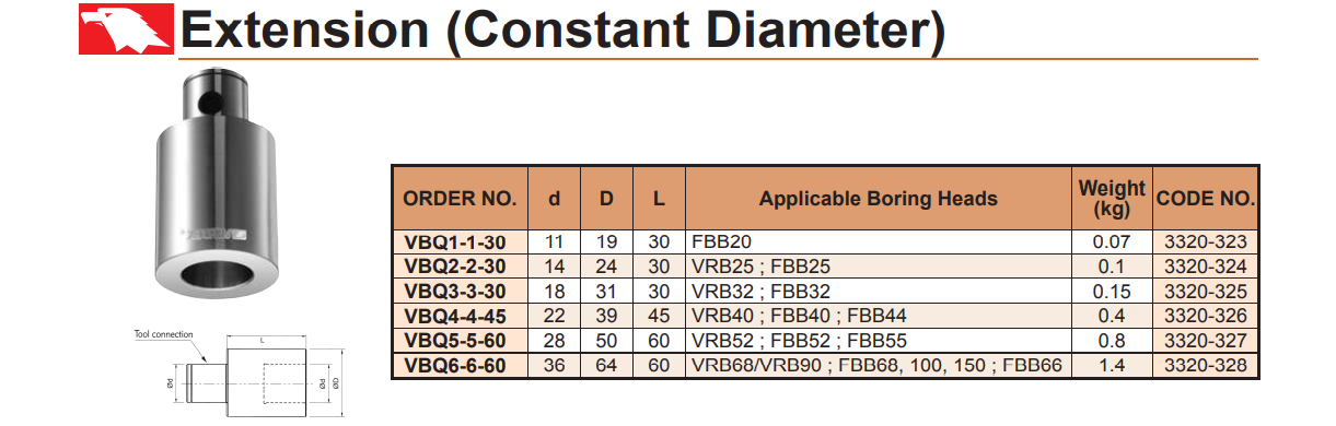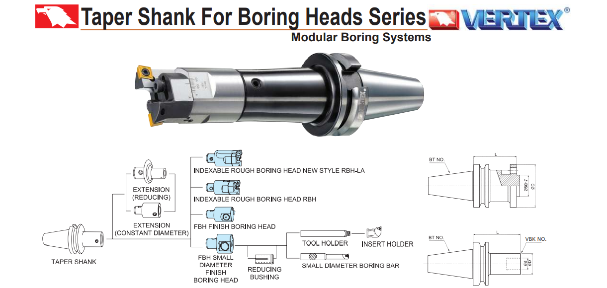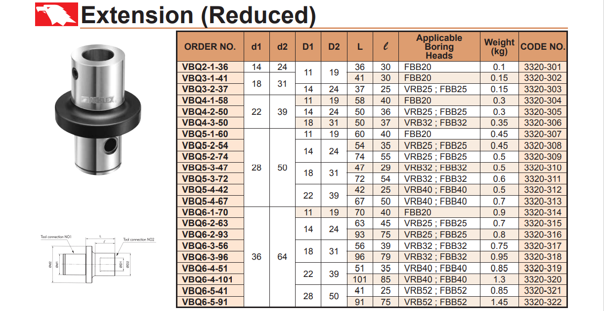 – Ống nối dài đầu dao doa VBQ: VBQ2-1-36, VBQ3-1-41, VBQ3-2-37, VBQ4-1-58, VBQ4-2-50, VBQ4-3-50, VBQ5-1-60, VBQ5-2-54, VBQ5-2-74, VBQ5-3-47, VBQ5-3-72, VBQ5-4-42, VBQ5-4-67, VBQ6-1-70, VBQ6-2-63, VBQ6-2-93, VBQ6-3-56, VBQ6-3-96, VBQ6-4-51, VBQ6-4-101, VBQ6-5-41, VBQ6-5-91 của VERTEX sử dụng nối dài các đầu dao doa để doa được lỗ có chiều sâu lớn hơn.