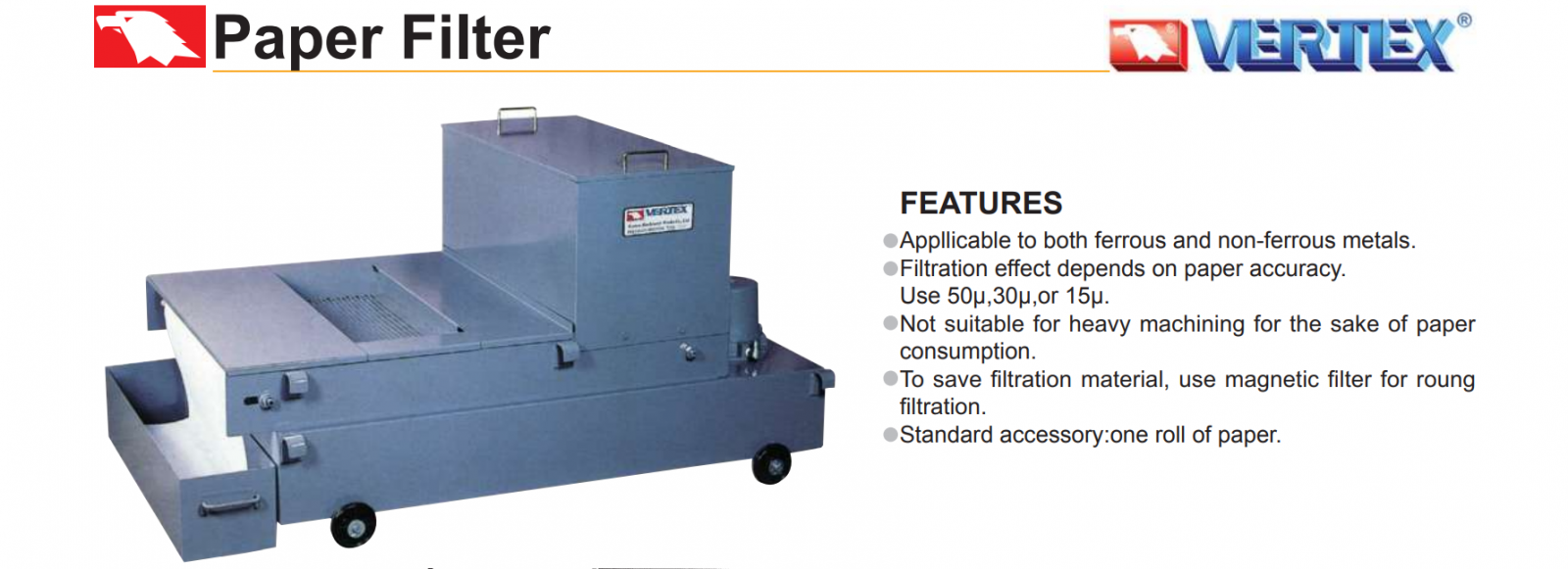 – Thiết bị lọc dung dịch làm mát bằng giấy lọc PF-20, PF-40, PF-60, PF-80, PF-120, PF-160 của VERTEX dùng lọc các phoi mịn ra khỏi dung dịch làm mát, dầu tưới nguội,…