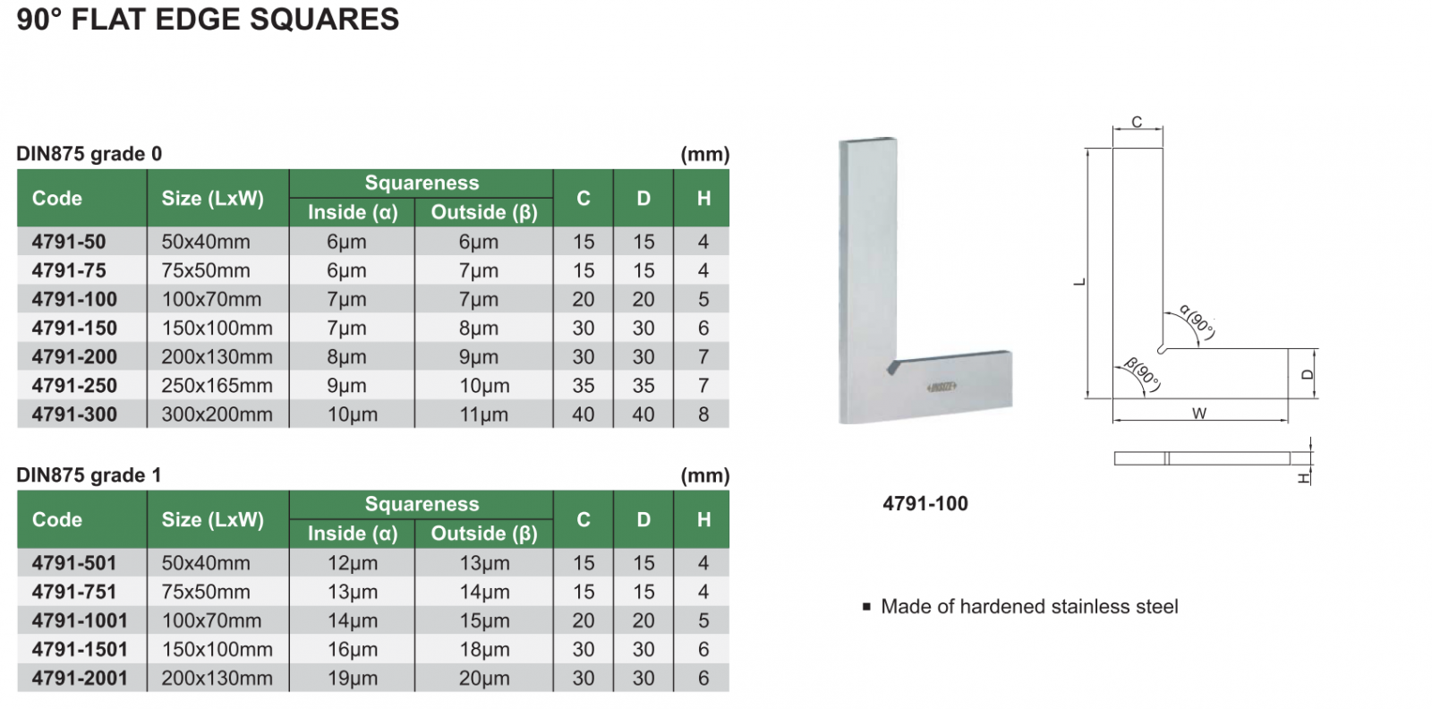 Thước đo góc INSIZE 4791-100, 90 độ FLAT EDGE SQUARES 4791-100