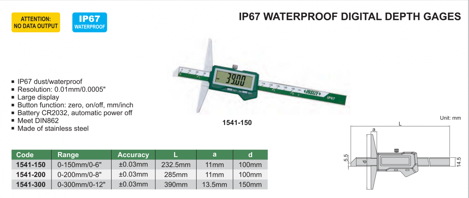 Thước đo sâu điện tử INSIZE 1541-150 , IP67 WATERPROOF DIGITAL DEPTH GAGES 1541-150 INSIZE là đồ dùng có nhiều chức năng phạm vi đo rộng, độ chính xác tương đối cao, dễ sử dụng, giá cả rẻ…